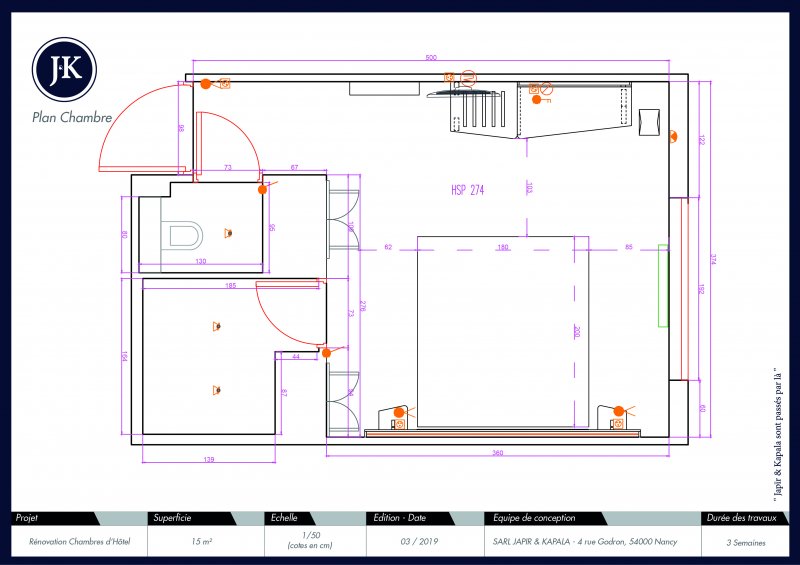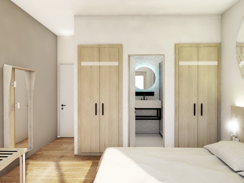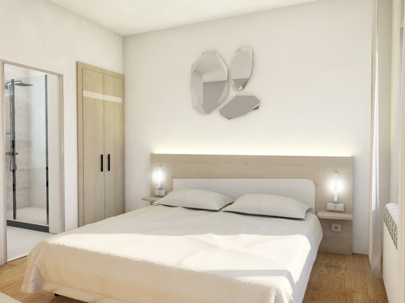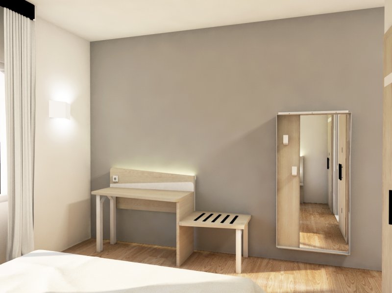 Notre client souhaitait redynamiser ses chambres vieillissantes, pour se faire nous avons retraité les espaces, les lumières ainsi que l’ensemble du mobilier pour répondre à une offre standard.