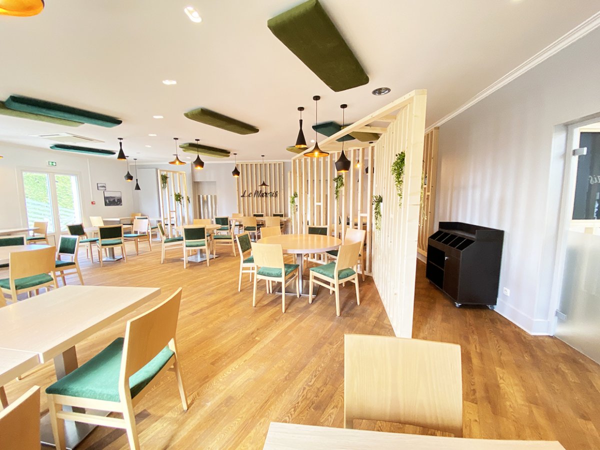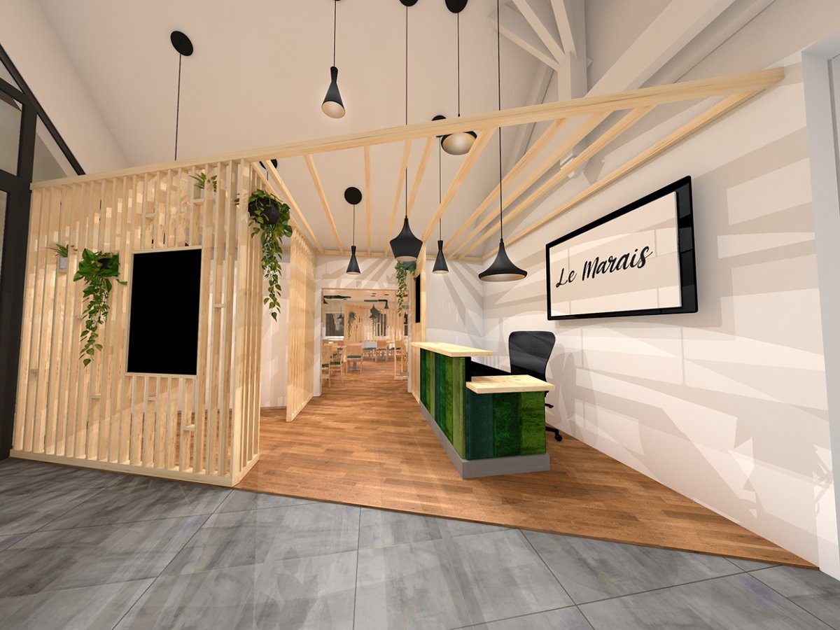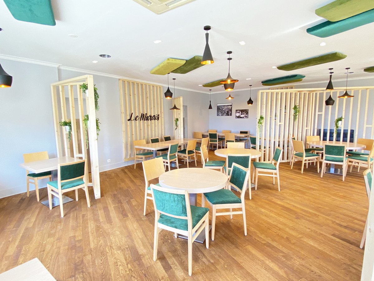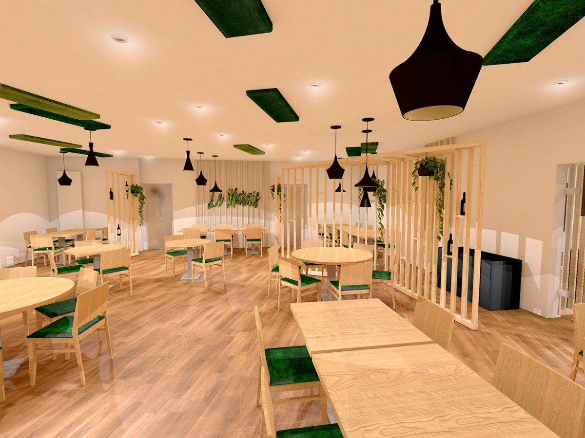 Aménagement et rénovation de la salle du restaurant d’un hôtel Kyriad. L’ancienne décoration étant impersonnelle nous avons homogénéisé la décoration sur une gastronomie biologique.