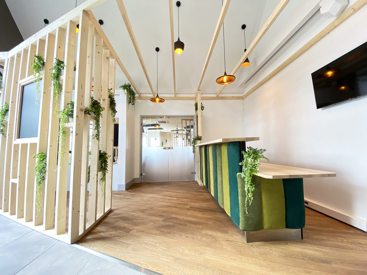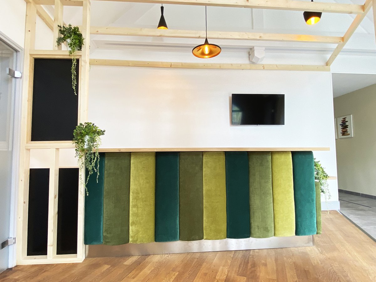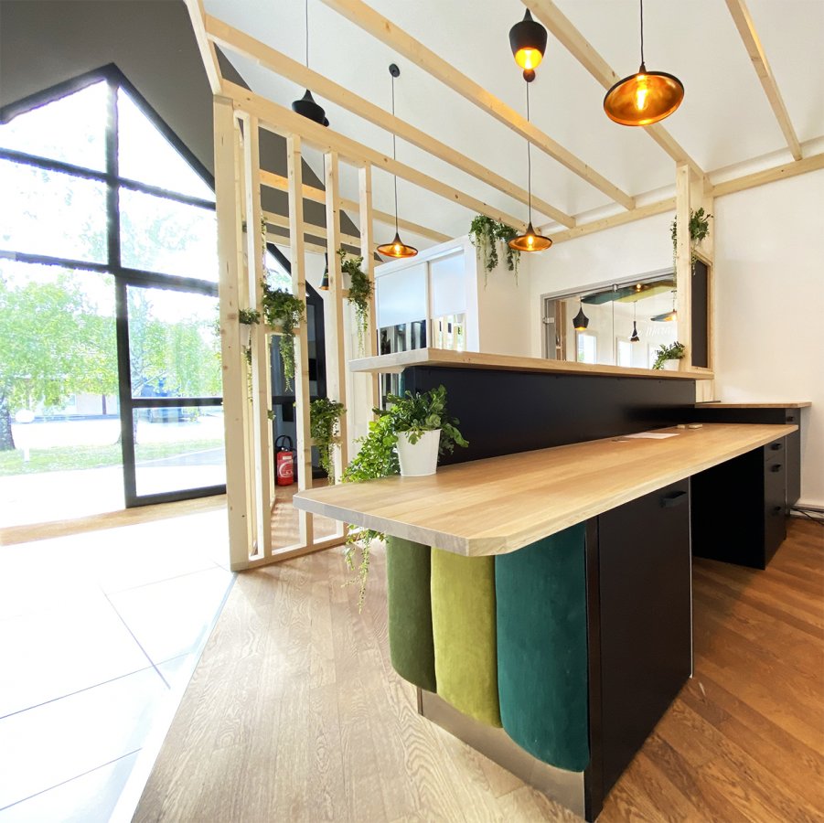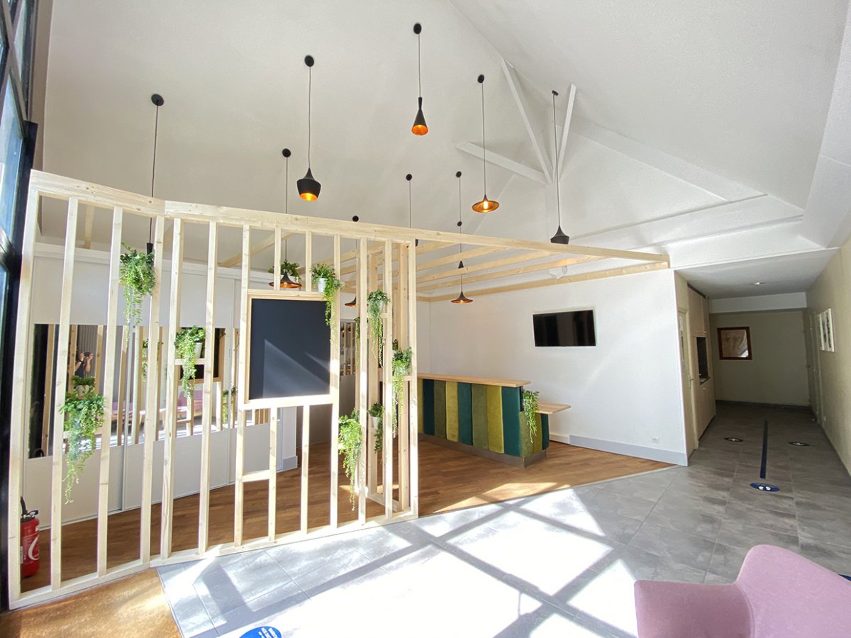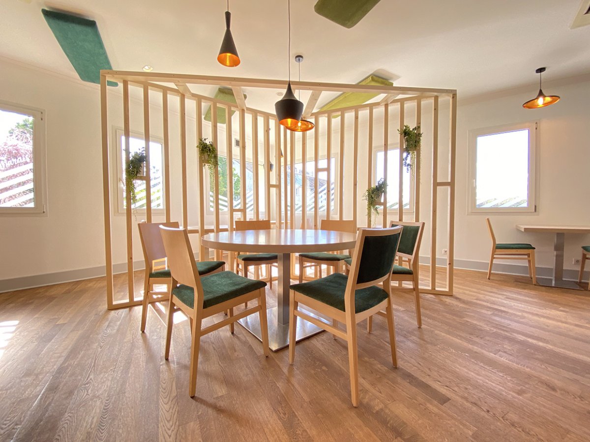 Aménagement et rénovation de la salle du restaurant d’un hôtel Kyriad. L’ancienne décoration étant impersonnelle nous avons homogénéisé la décoration sur une gastronomie biologique.