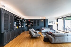 Création et rénovation d’une terrasse tropézienne. Nous avons agrandi l’espace en ouvrant la charpente, en ajoutant un bardage en zinc graphite et des lames de bambou pour le sol. Des spots extérieurs ont été installés le long des marches afin de créer un jeu de lumière.
